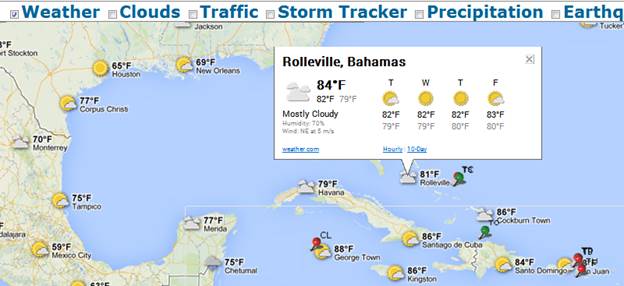 It shows current weather conditions from www.weather.com on your map, including icons that denote sun, clouds, rain and so on. Clicking on the weather icon for a particular area will open an info window with detailed data such as current humidity and wind conditions, as well as a four-day forecast.