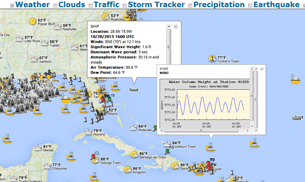 It shows the following marine information transmitted by buoy such as barometric pressure; wind direction, speed, gust, air, sea temperature, wave energy spectra from which significant wave height, dominant wave period, and average wave period provided by the National Data Buoy Center and NOAA http://www.ndbc.noaa.gov/